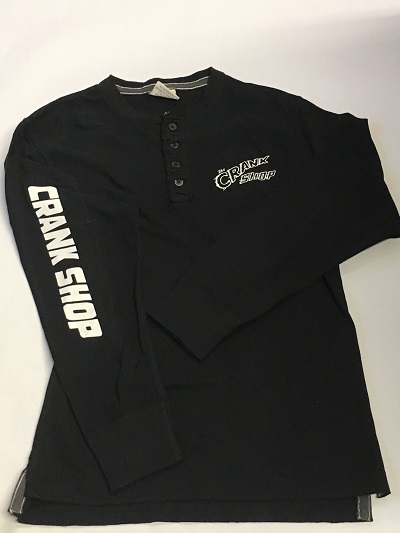 Henley with four buttons black long sleeve, and screen printed Crank Shop on left chest and right arm sleeve.
